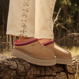 נעלי ה-Tazz עם סוליית פלטפורמה בגובה 4.45 ס"מ עם ריפוד וסטייל. מעוצבות מזמש עשיר, מרופדת בתערובת צמר עם לוגו UGGplush למראה דמוי נעלי בית. להרגיש בפנים בחוץ.